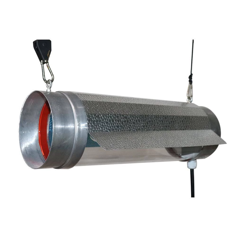 The Hydro Crunch Grow Light System combines our digital ballast which is UL listed and has the ability to dim 1000-Watt, 600-Watt, 400-Watt and also has a super lumen enhanced setting to maximize the grow light systems output. Digital ballasted lighting systems generate roughly 30% more PAR (photo synthetically active radiation) for every watt of electricity consumed compared to the magnetic (core and coil) ballasts of the past. Digital ballasts are more efficient at turning electricity into light and because light intensity often directly correlates to yield you can expect more production for the same electric bill. Each grow light system comes with a plant specific HPS (high pressure sodium) bulb designed specifically for horticultural use. The Cool Tube with Wing cylinder shaped reflector comes pre-wired with detachable ballast cord and an E39 socket which will accommodate HID bulbs (both HPS and MH). The 6 in. Cool Tube with Wing grow light reflector comes with a pebbled, polished reflector for ultimate dispersion and reflectivity and can be air cooled allowing you to reroute unwanted heat out of the growing area using 6 in. ducting and inline fan (not included). The grow light system comes with a grounded multi-pin timer to control your photo cycles along with a ratchet light hanger for easy hanging and up and down adjustments over the plant canopy.
