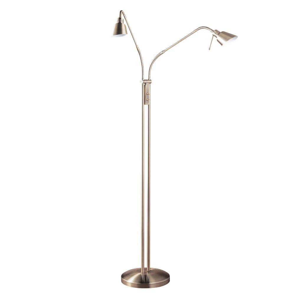 This Dual Light Designers Choice Collection Antique Brass Floor Lamp provides an ideal source of Task or Reading light while adding a distinctively contemporary element to the decor of your home or work area. Separate toggle switches are provided for independent control of each 50-Watt halogen, fully adjustable arm.