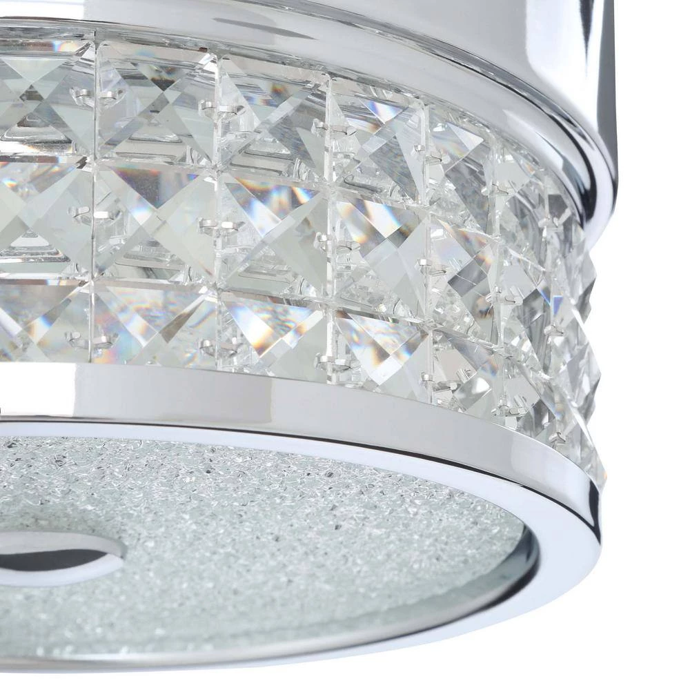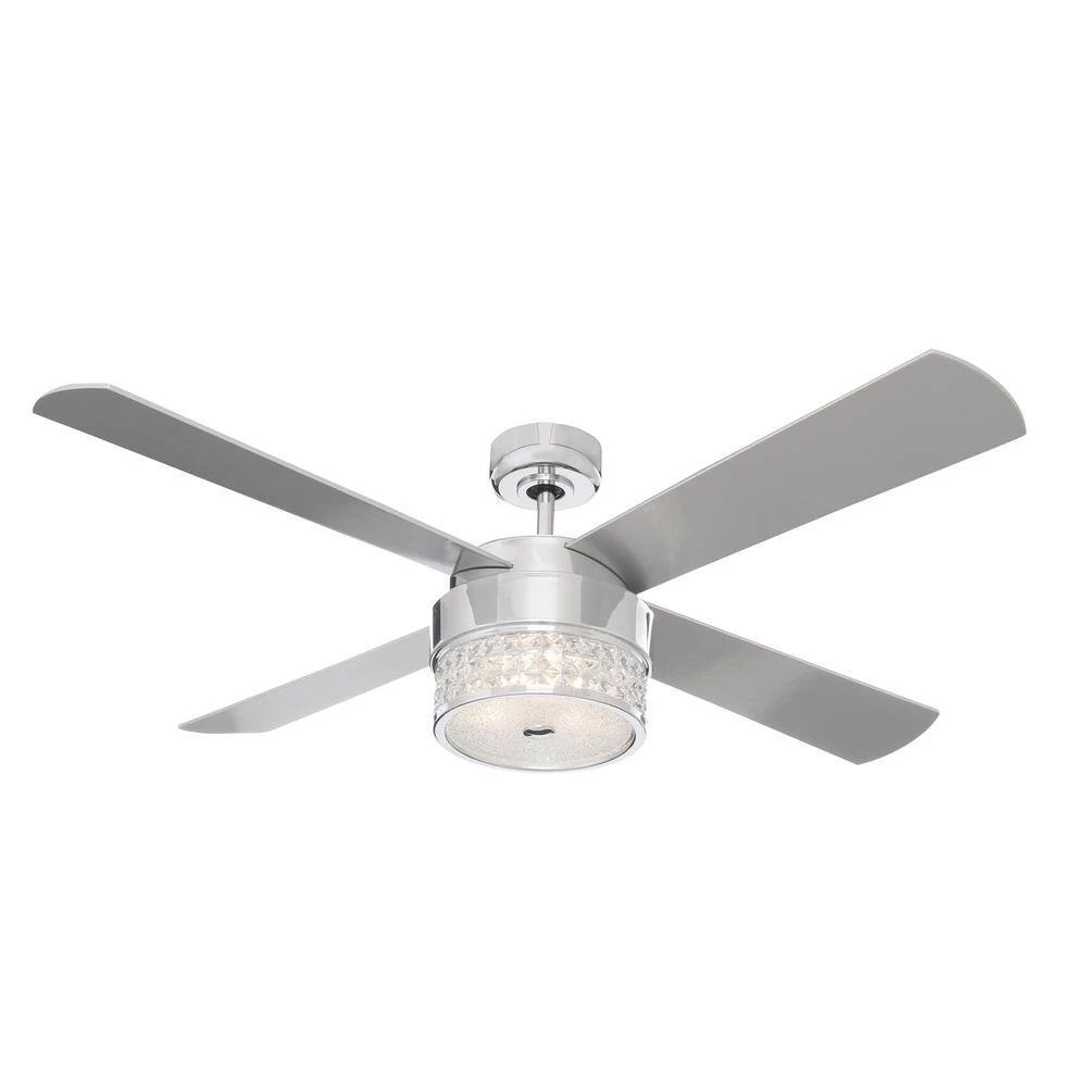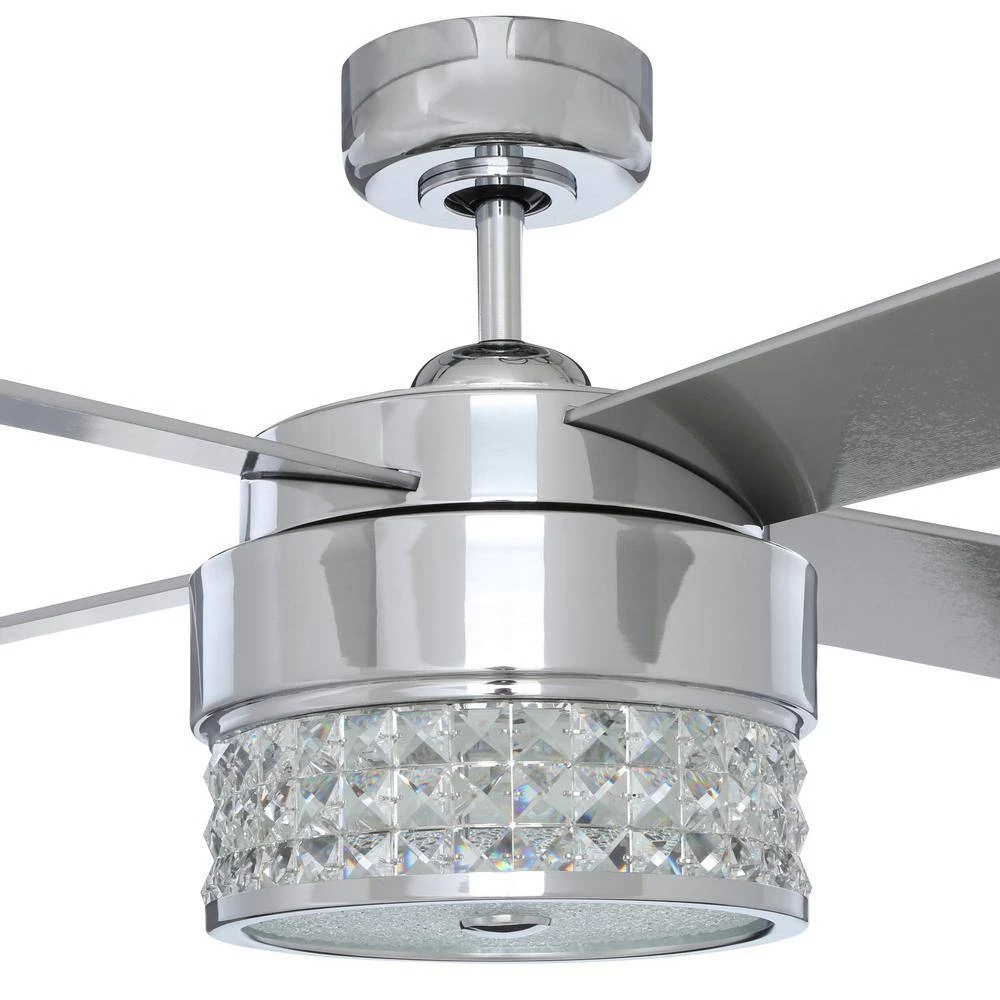 The Designer’s Choice Collection Celestra 52 in. Ceiling Fan adds an element of elegance to your living space. Optic Crystal jewel insets surround an integrated LED light kit to illuminate with dazzling brilliance. The clean Chrome finish of the motor housing is complemented with 4 Silver blades. A wall mounted remote control featuring a convenient pull-out style transmitter providing 3 speeds and LED light dimmer is included.