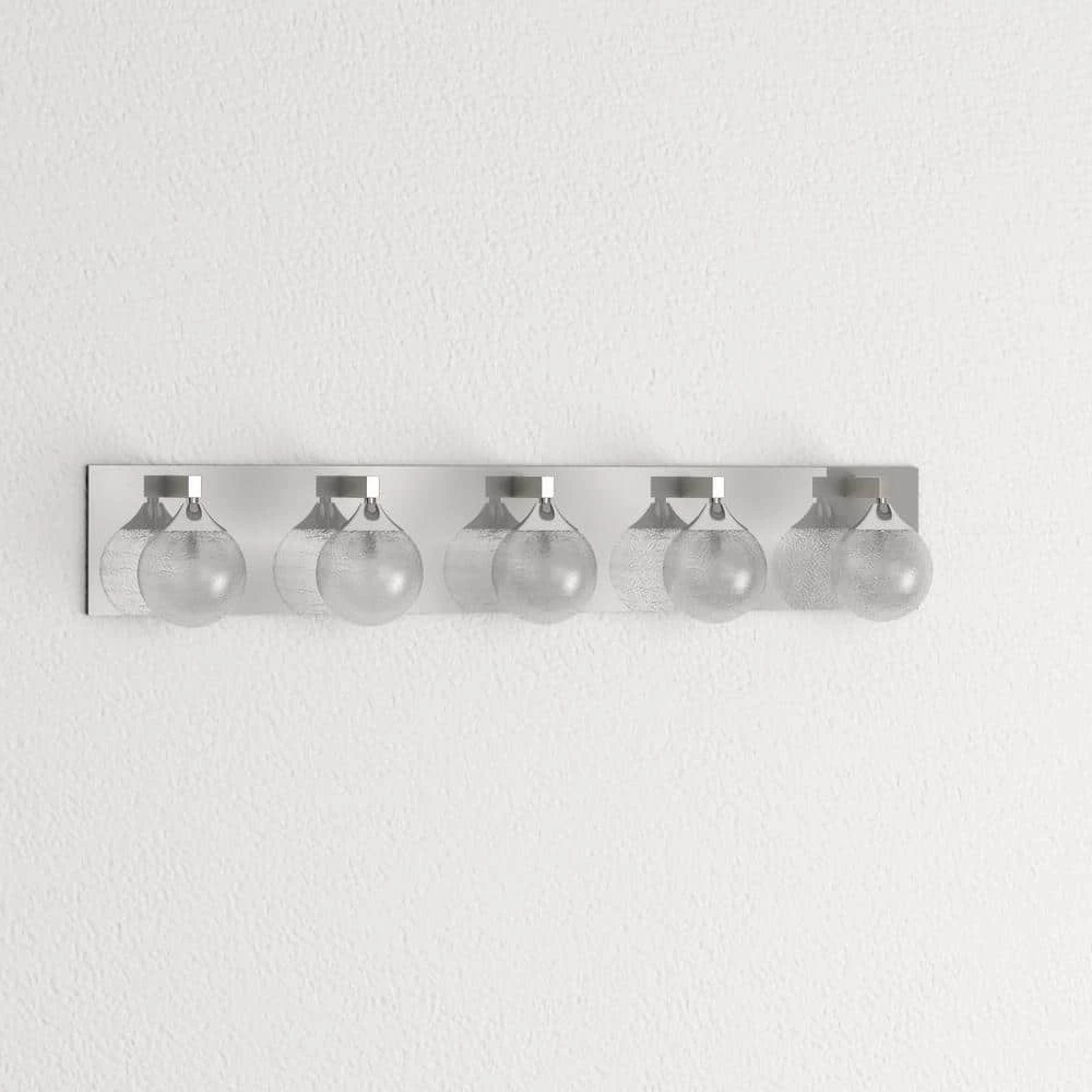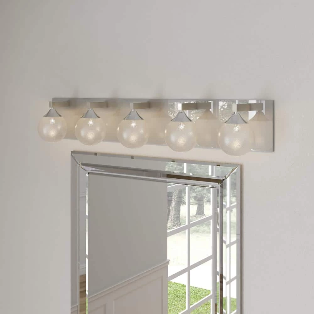 The distinctive appeal of the FYBRA series 5-Light 36 in. Bath light enriches modern interiors. Halogen light dances off stretched glass fibers encased in clear glass globes. A clean chrome finish completes the look while providing 200-Watt of illumination.