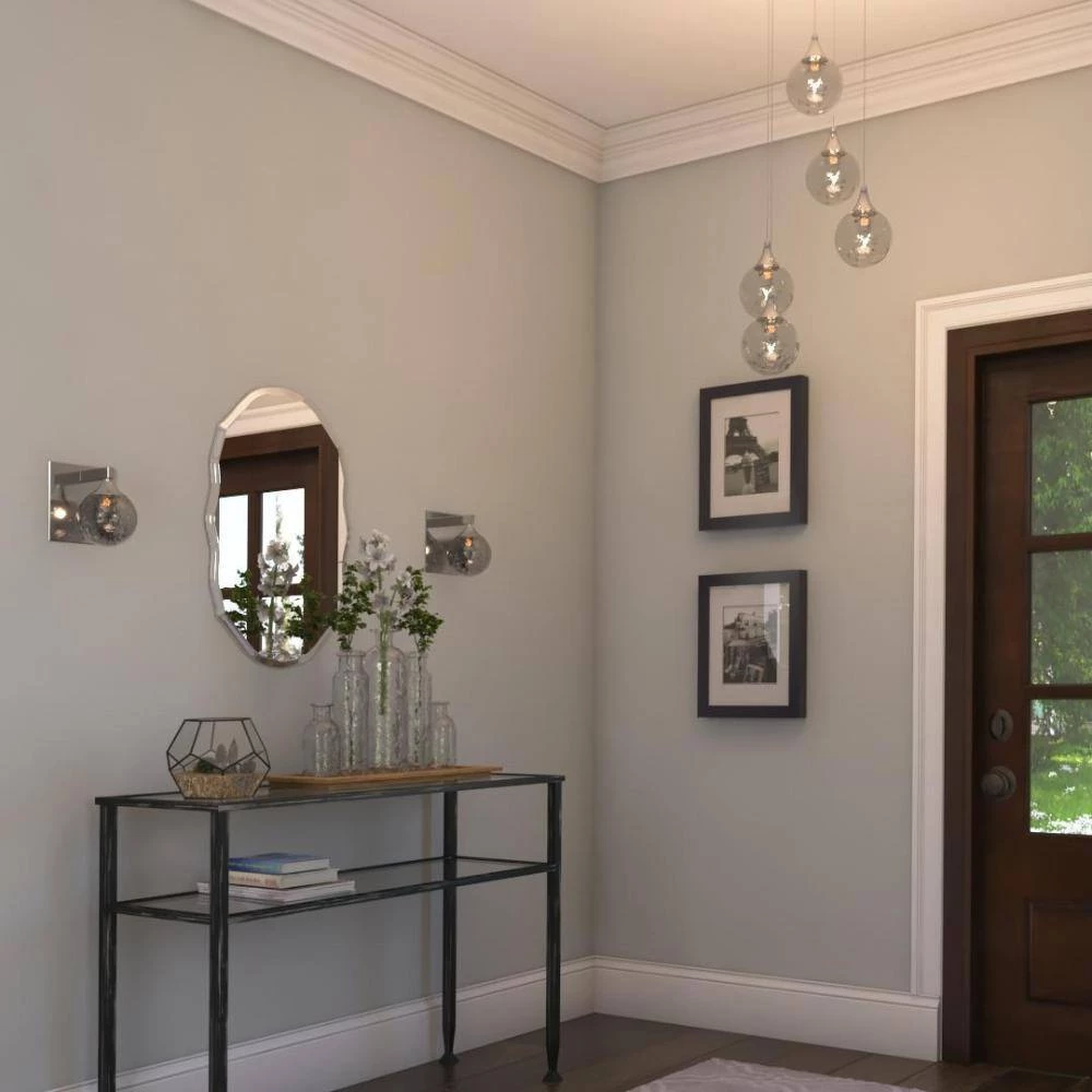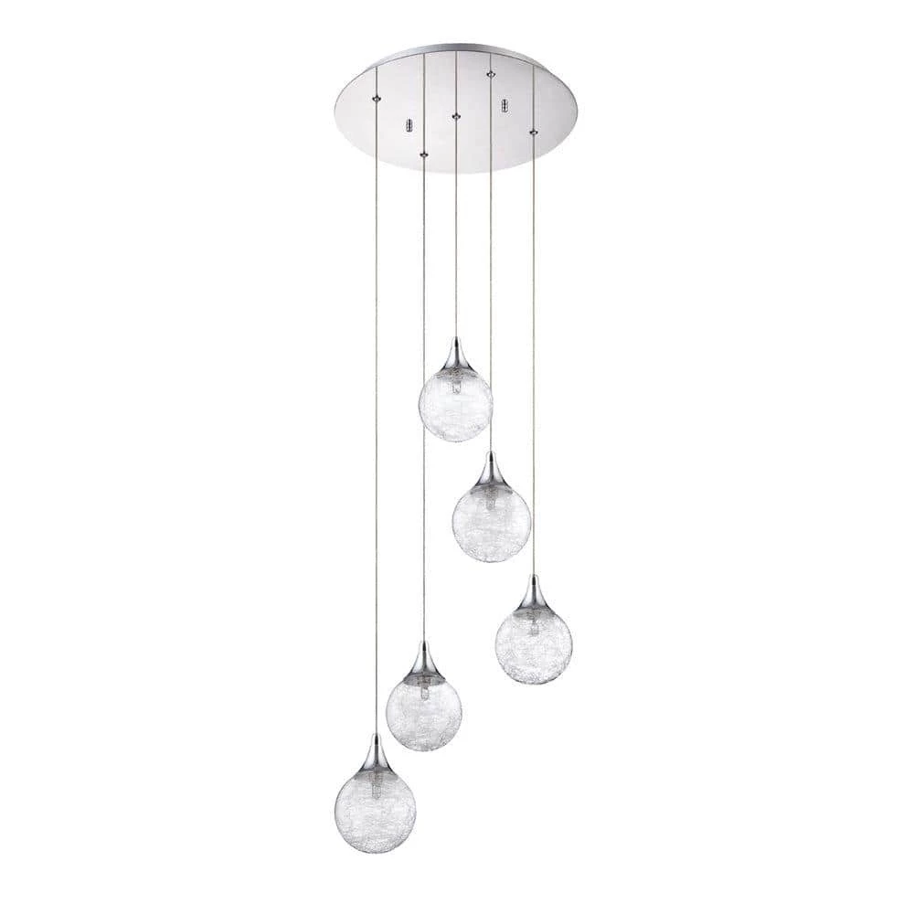 The distinctive appeal of the FYBRA series 5 light Pendant Pan enriches modern interiors. Halogen light dances off stretched glass fibers encased in a cascade of clear glass globes. A clean chrome finish completes the look while providing 250-Watt of illumination. Pendant length is fully adjustable to customize your look or suit any application.