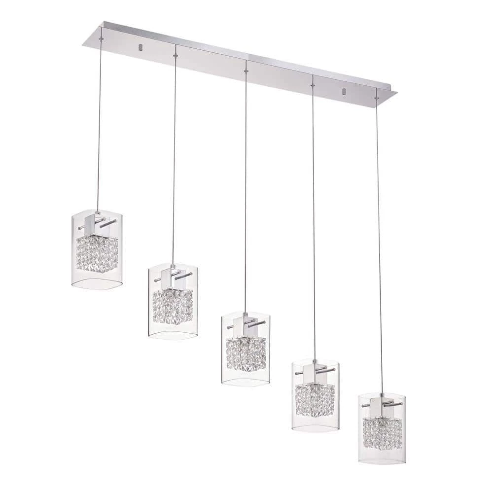 The unique styling of the Politan Series 5 light Pendant Bar adds contemporary flair to your living space. The clean chrome finish compliments softly squared clear glass shades surrounding strands of optic crystal suspended in a cube pattern. Matching single pendant or multi-pendant Bars and Pans are available to flawlessly coordinate your decor.